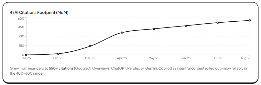 - 400-600 AI citations/month across ChatGPT, Perplexity, Google AI Overviews, Gemini, and Copilot